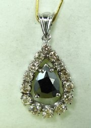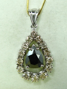 Gold and diamonds pendant with pear shaped color stone at the center.
